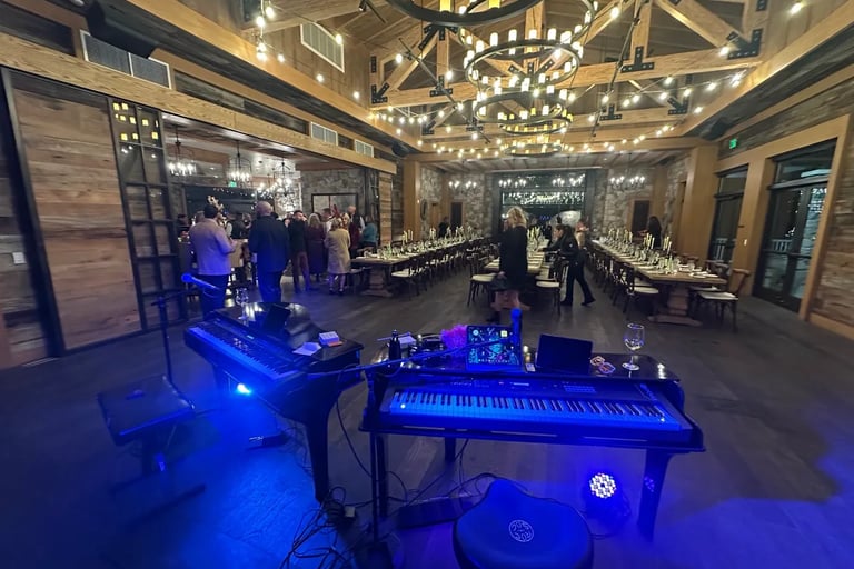 That said, the ideal dueling pianos venue is an enclosed space where the energy is contained and the crowd has easy access to the players. The interactive nature of the show - guests coming up with requests, singing along, participating - works best when everyone feels connected to the performance. Sometimes the best setup is actually having the pianos in the middle of the room with the party all around us.