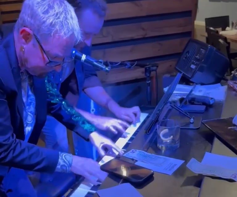 We use professional-grade digital pianos housed in grand piano shells - they look like beautiful grand pianos and deliver exceptional sound quality. Most guests don't realize they're digital until we tell them! This approach gives you the authentic dueling piano aesthetic and sound while being practical for a wide range of venues and logistics.